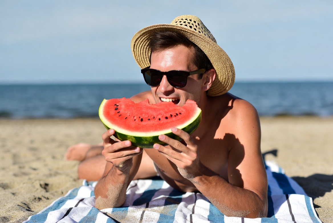 White, beach, beach towel, eating watermelon, juicy fruit, lying down, male, ocean, outdoors, relaxed, sand, sea, shirtless, straw hat, summer, sunglasses, topless, tropical, vacation, watermelon slice, man
