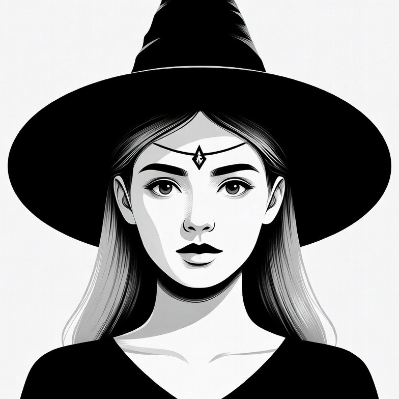 Black and white illustration of a young woman with long wavy hair and a forehead jewel. She wears a tall pointed black witch hat and a black dress with a V-neckline. Her face shows subtle makeup and direct gaze, set against an isolated white background.