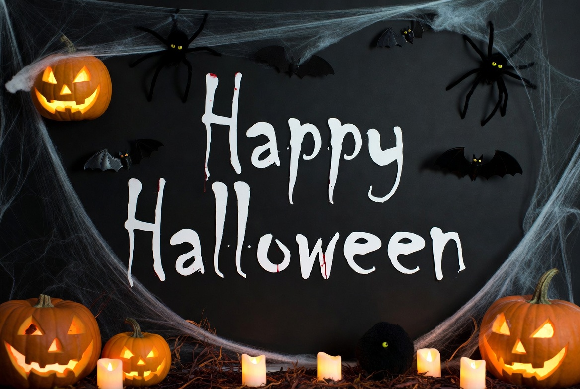 A dark background features white text reading 'Happy Halloween' surrounded by orange jack-o'-lanterns, black bats, spiders, and cobwebs. Small candles and a black fuzzy spider sit at the bottom amid straw. The spooky decorations create a festive Halloween scene.