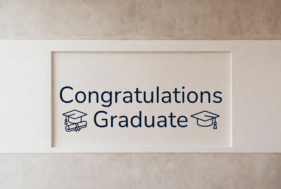 A white framed sign displays 'Congratulations Graduate' in bold navy text. Flanking the words are illustrations of a graduation cap and diploma on the left and a single graduation cap on the right. The sign is mounted against a beige textured wall.