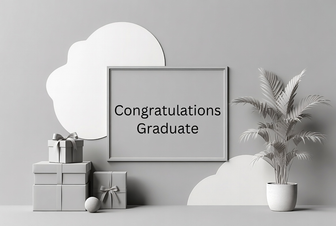 3D illustration, 3D render, achievement, celebration, cloud shapes, clouds, gift boxes, gifts, graduate, graduation, gray background, isolated background, minimalist, palm plant, picture frame, potted plant, ribbon, text frame, white pot, congratulations graduate