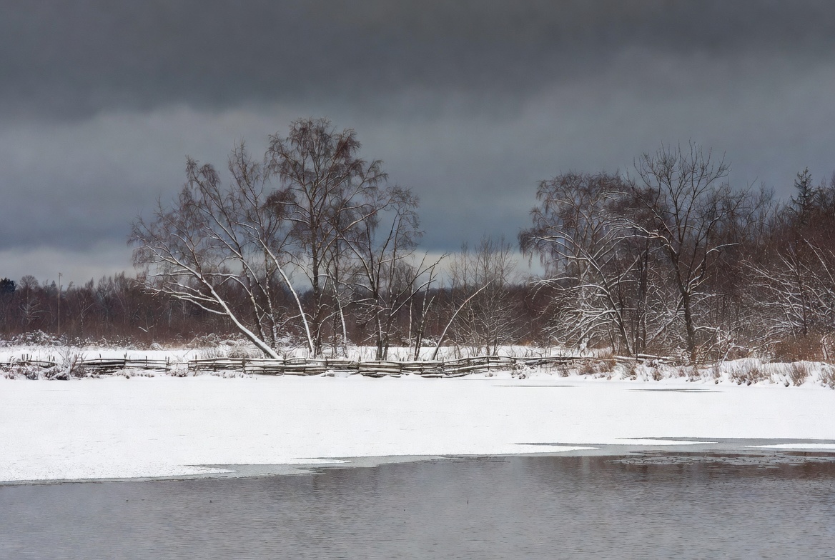 Bare birch trees stand along a snowy landscape under a dark gray cloudy sky. A wooden fence runs parallel to the trees near a frozen lake with thin ice. Snow covers the ground and distant bushes.