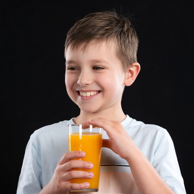 A young boy with short brown hair smiles while holding a tall glass of orange juice. He wears a light blue t-shirt and stands against a black background. His hand grips the clear glass filled with vibrant orange liquid.