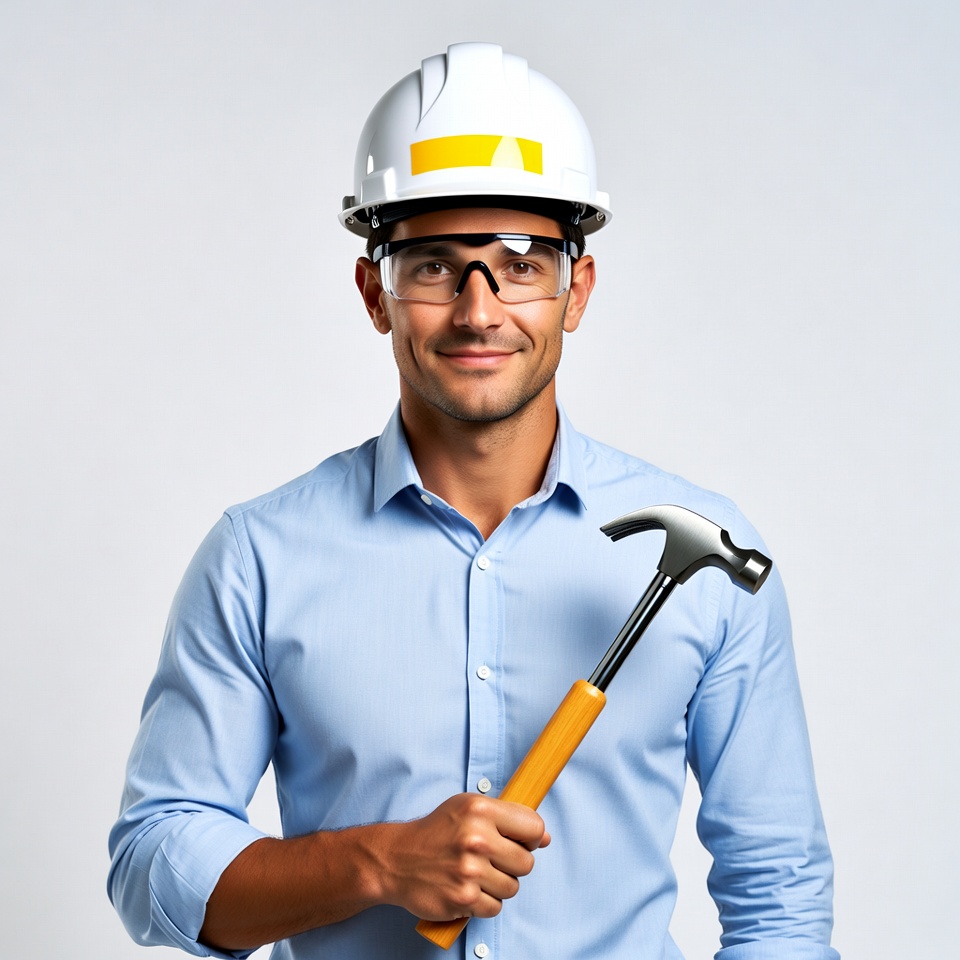 A smiling man wears a white hard hat with a yellow stripe and dark safety goggles. He is dressed in a light blue button-up shirt and holds a hammer with an orange handle in his right hand. He stands confidently against a plain white background.