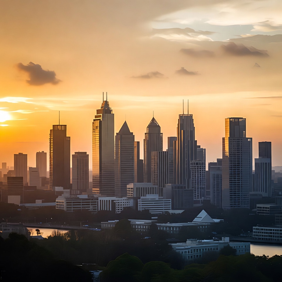 architecture, cityscape, clouds, dusk, evening sky, glowing sky, golden hour, high-rises, horizon, modern buildings, orange sky, river, silhouette, skyscrapers, sunset, tall towers, trees, urban landscape, waterfront, city skyline