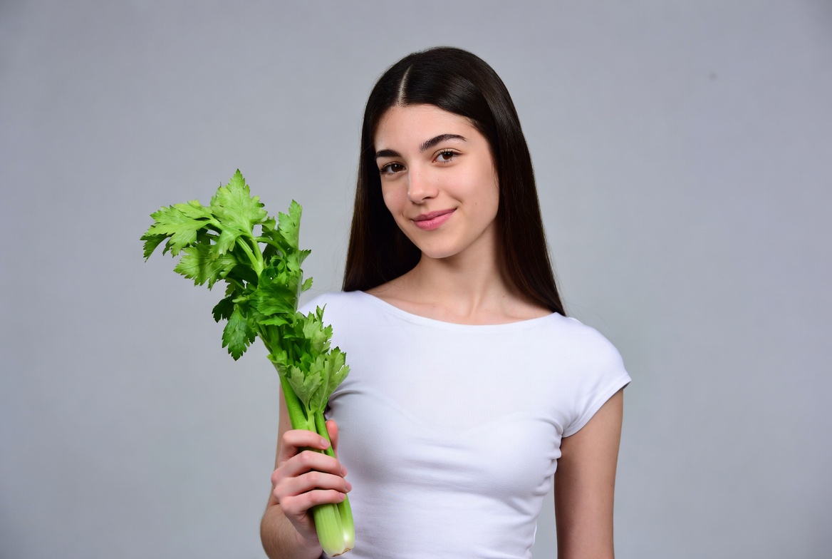 A young woman with long dark hair smiles while holding a bunch of fresh green celery stalks in her hand. She wears a white short-sleeved top and stands against a plain gray background. The celery is prominently displayed in her grip.