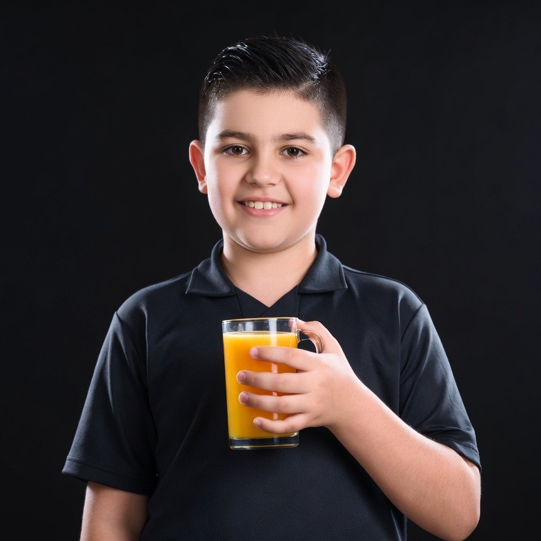 A young boy with short dark hair and a smile holds a tall glass of orange juice in front of a black background. He wears a black polo shirt and grips the clear glass with both hands. The vibrant orange juice fills the glass nearly to the top.
