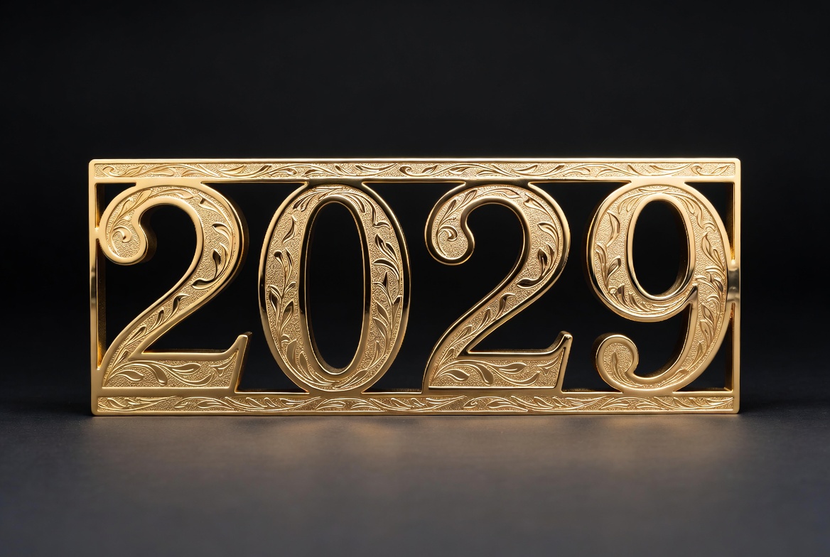 Ornate gold numerals forming the year 2029 are centered on a black background. The numbers feature intricate filigree designs and are framed by a decorative gold border. The metallic gold shines brightly against the dark surface.