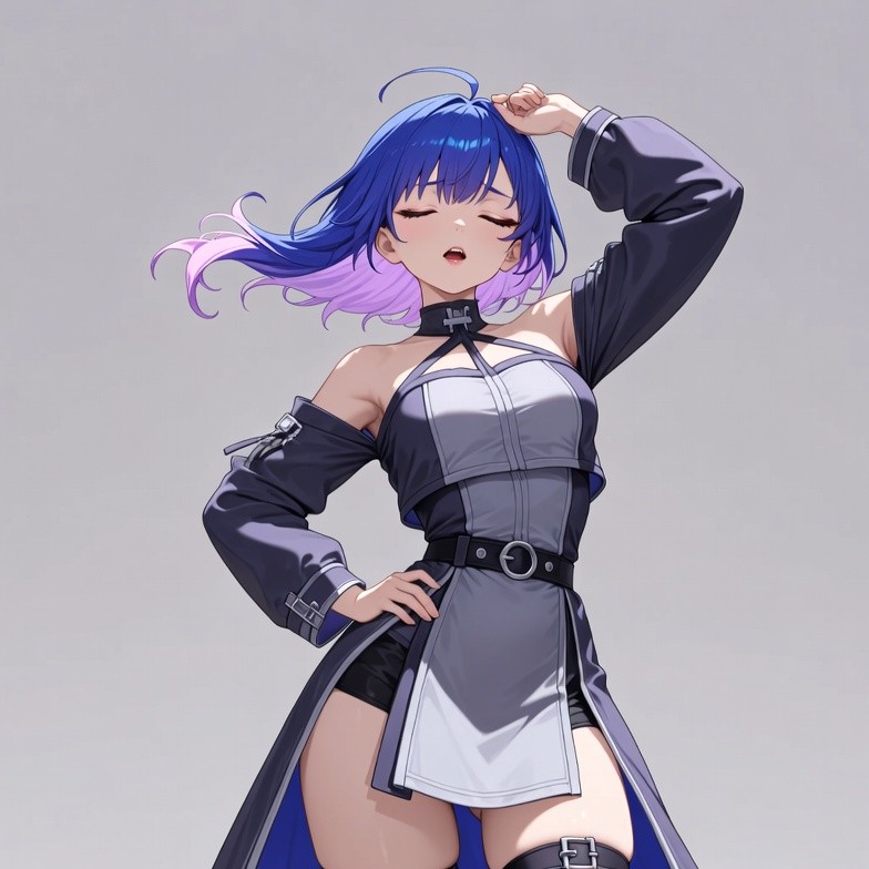 A blue-haired anime girl with purple highlights stands confidently on a plain gray background. She wears a black and gray strapless dress with white accents, a choker, belt, and thigh-high straps. Her right hand rests on her head while her left hand is on her hip, with flowing hair and a slight open-mouth expression.