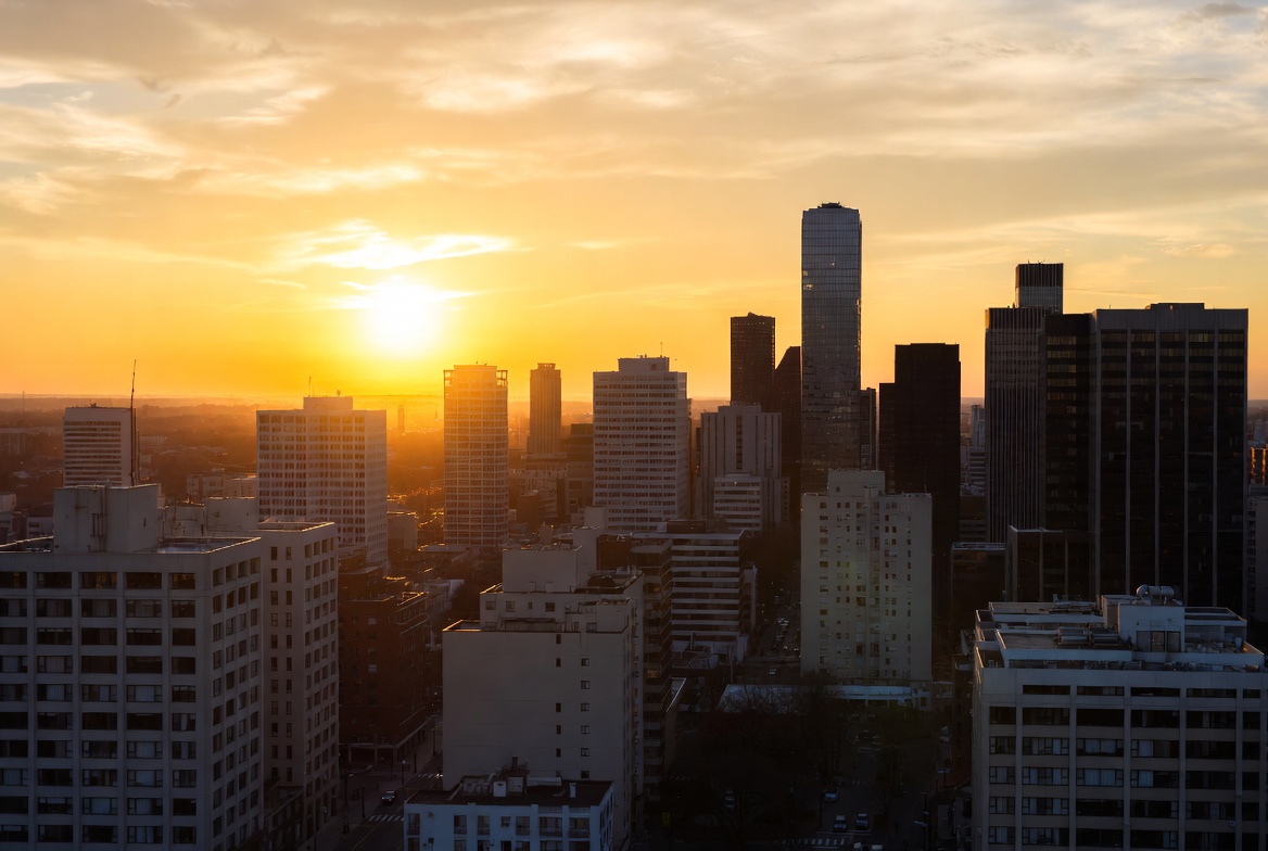 architecture, city skyline, cityscape, clouds, dusk, golden hour, high-rise buildings, horizon, metropolis, orange sky, skyscrapers, sunlight, tall buildings, urban landscape, sunset