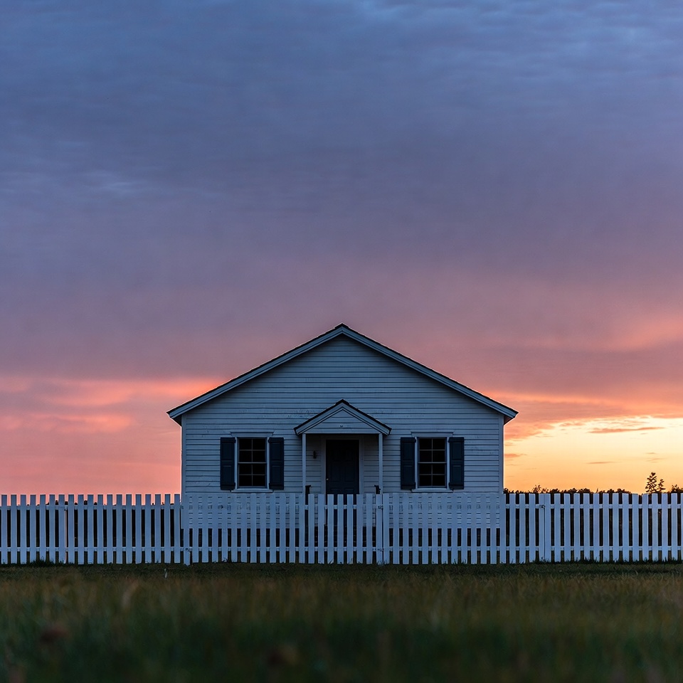 White house with picket fence at sunset
