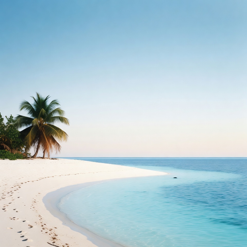 A pristine white sand beach curves along clear turquoise ocean waters under a bright blue sky. Two tall palm trees stand on the shore with footprints visible in the sand. The serene scene features calm waves and distant greenery.