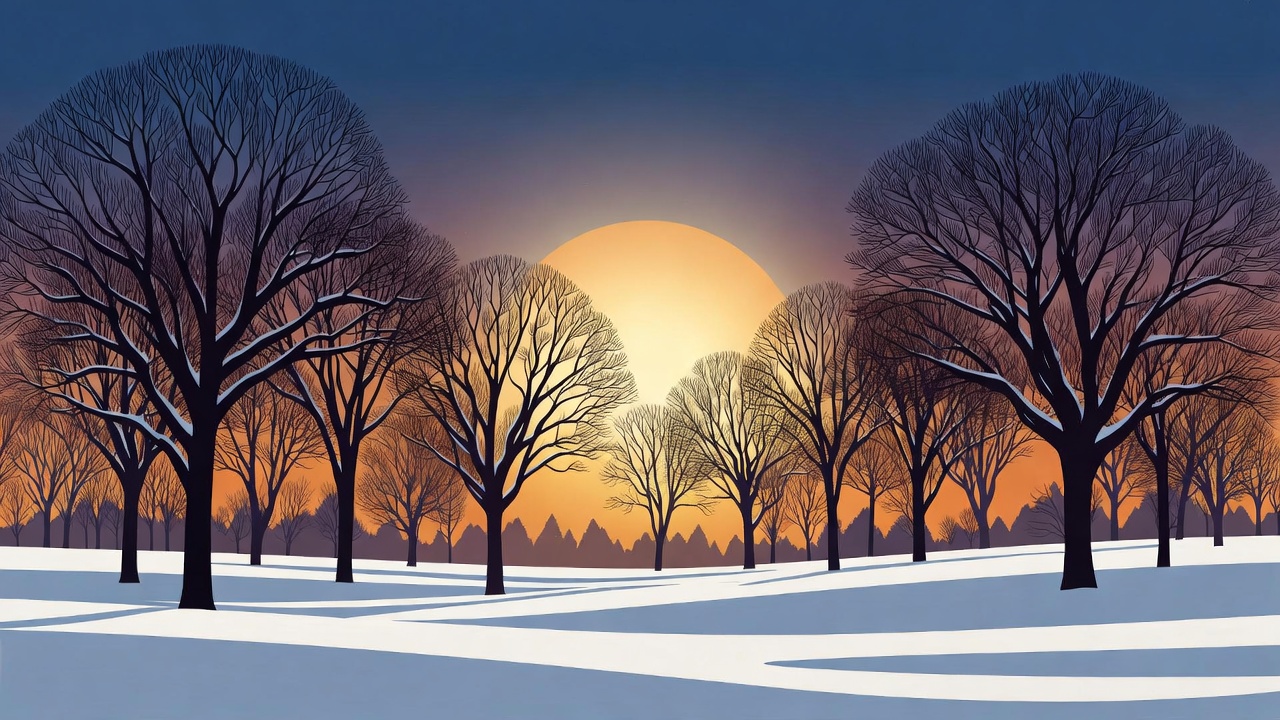 A vibrant vector illustration depicts a row of bare trees covered in snow under a large glowing orange sun at sunset. The dark blue sky contrasts with the warm sunlight illuminating the snowy field and tree branches. Shadows stretch across the white landscape in this panoramic winter scene.