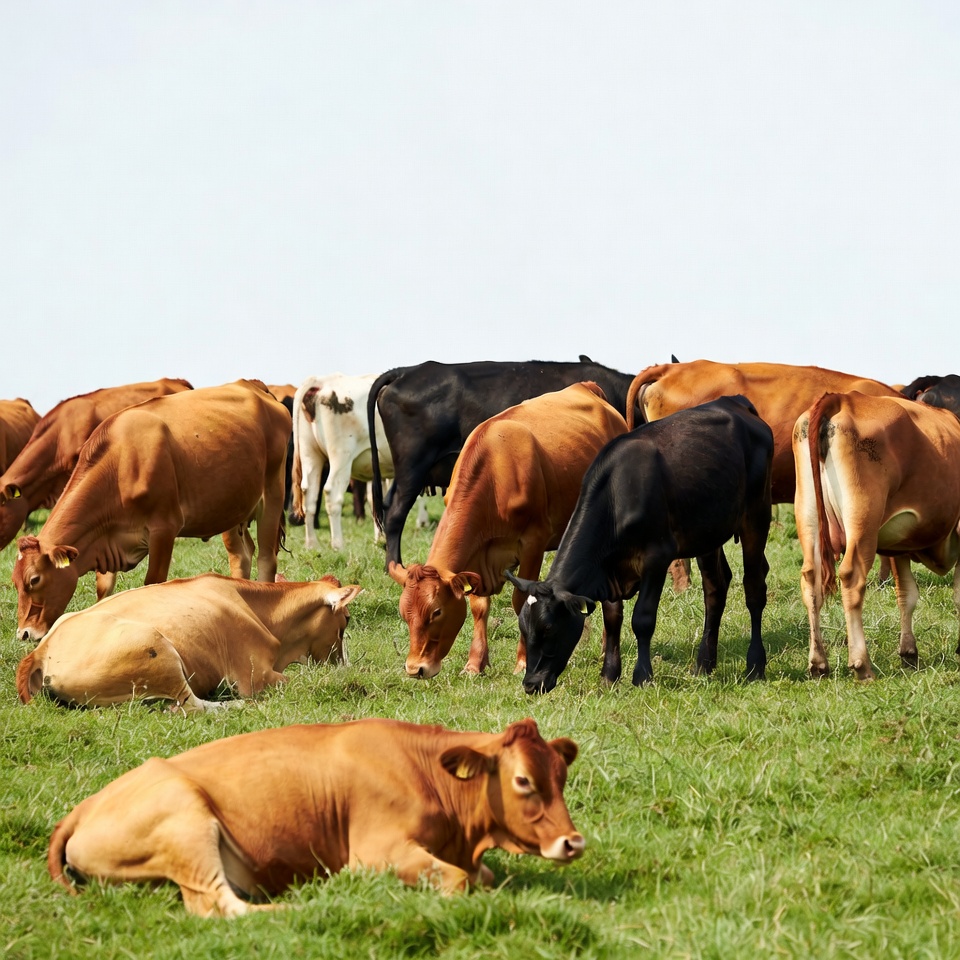 A large herd of cows in various colors including brown, black, and white grazes on lush green grass in an open field. Some cows stand while others lie down, all against a clear sky background. The scene captures a peaceful pastoral landscape with the animals feeding naturally.