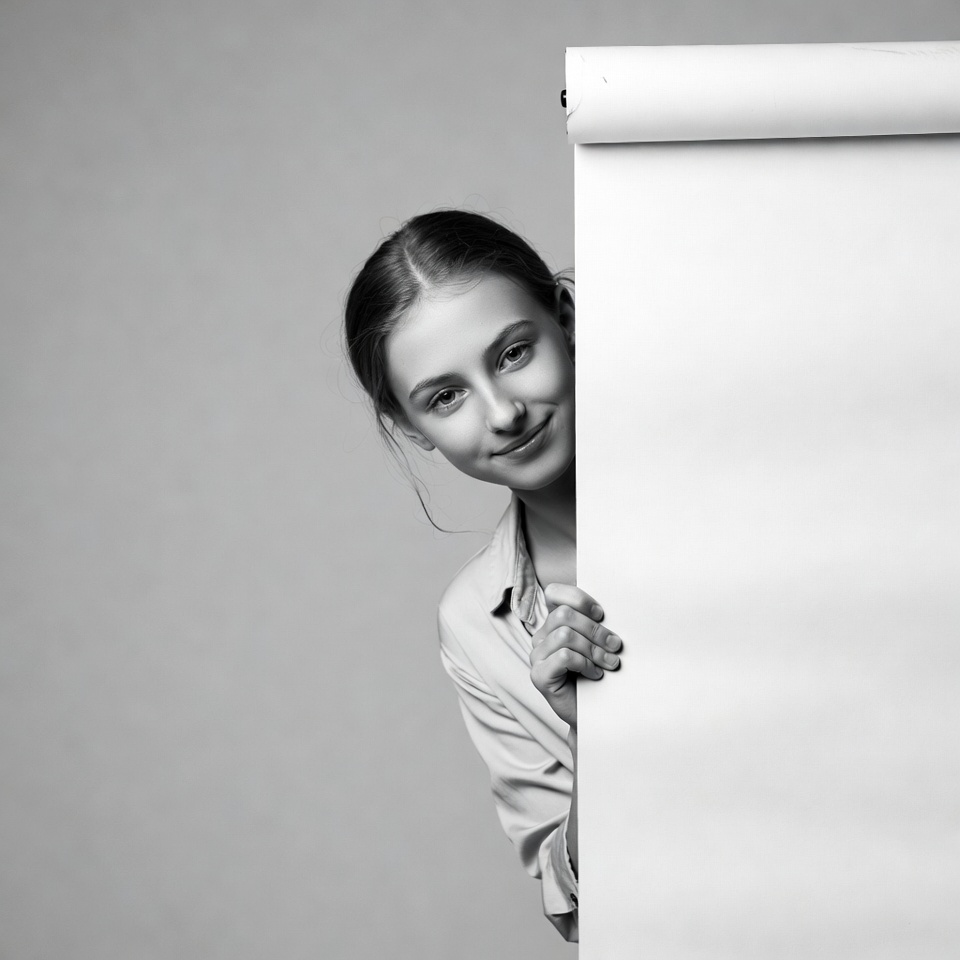A young girl with straight brown hair peeks playfully from behind a large white rolled paper. She wears a light-colored shirt and smiles while gripping the edge of the paper with both hands. The image is in black and white against a plain gray background.