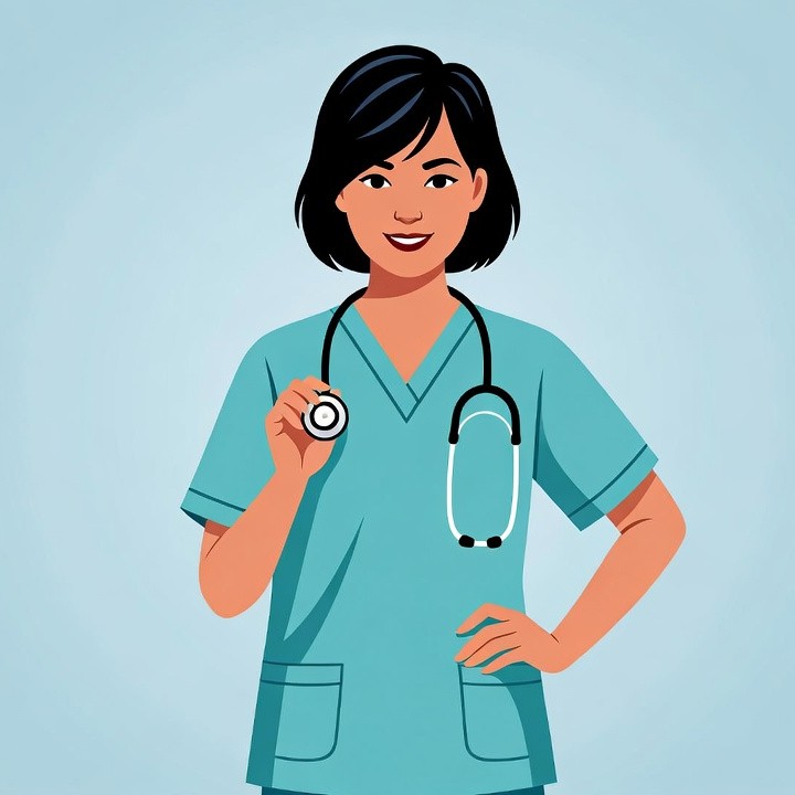 An Asian woman dressed in a teal nurse uniform holds a stethoscope in her right hand. She has short black hair, a friendly smile, and stands confidently with her left hand on her hip. The illustration features a plain light blue background.