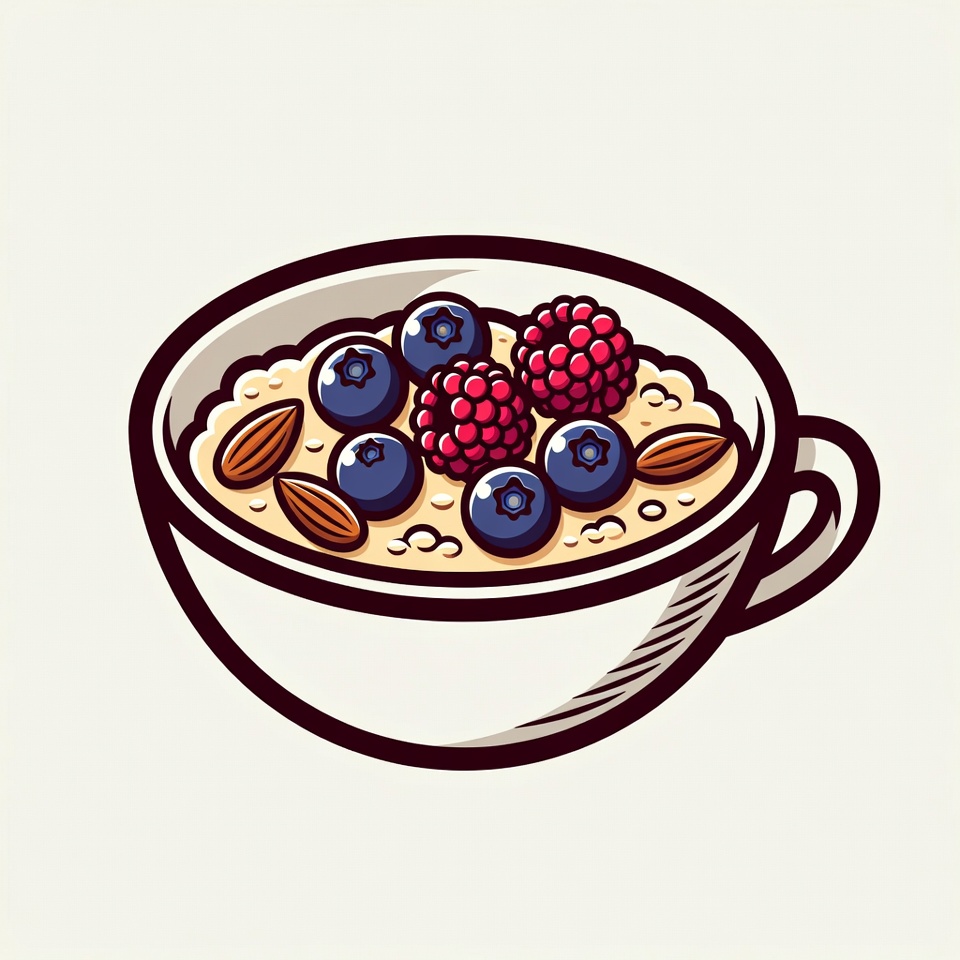 A colorful illustration of a white bowl filled with oatmeal topped with fresh blueberries, raspberries, and sliced almonds. The bowl features a simple handle and sits on a plain background. Vibrant outlines highlight the berries and nuts.