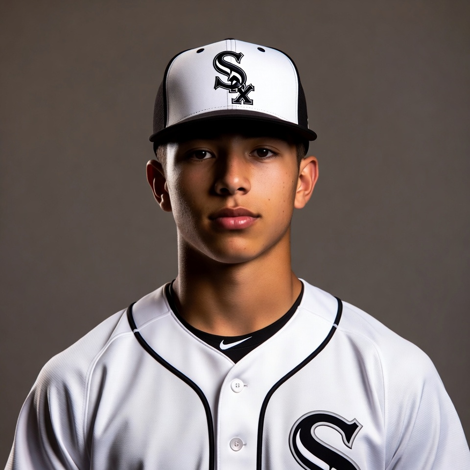 A young Latino man with short black hair wears a white Chicago White Sox baseball cap and matching jersey. He stands against a gray background with a neutral expression, facing the camera directly. The cap features the black SOX logo prominently on the front.