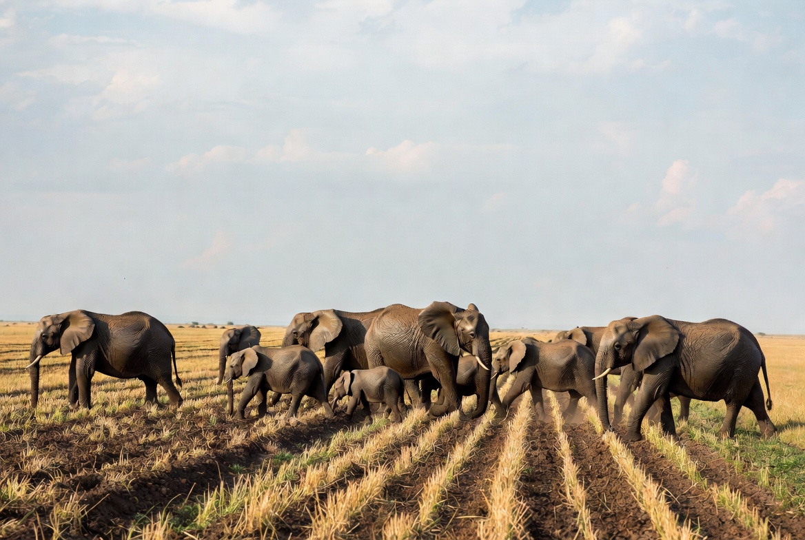 A large herd of African elephants walks across a dry, grassy field with rows of tilled soil. Several adults and young calves move together under a partly cloudy sky. The elephants have gray skin and long trunks, grazing in the savanna landscape.