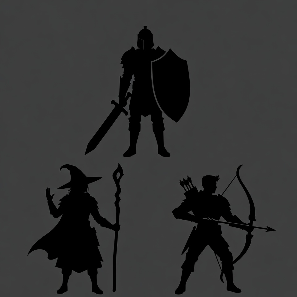 Three black silhouettes stand against a gray background. A knight in armor holds a sword and shield, a wizard in a hat and robe grips a staff, and an archer draws a bow. The fantasy figures are depicted in profile view with detailed outlines.