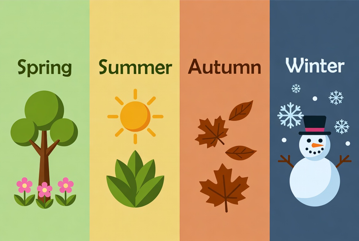 A colorful illustration displays the four seasons in four vertical panels. Spring features a green tree with pink flowers, summer shows a bright yellow sun and green leaves, autumn has orange maple leaves, and winter depicts a snowman with snowflakes. Each panel is labeled with the season name in bold text on a matching background.