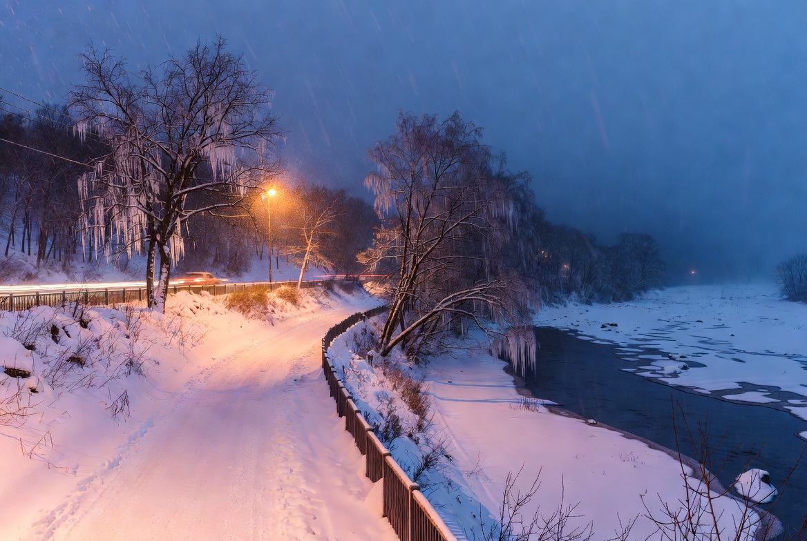 bare trees, blue sky, cold weather, curved road, falling snow, frozen river, headlights, ice, illuminated trees, night sky, pathway, railing, riverside, snow, snowflakes, streetlamp, trail lights, winter landscape, winter night, snowy road