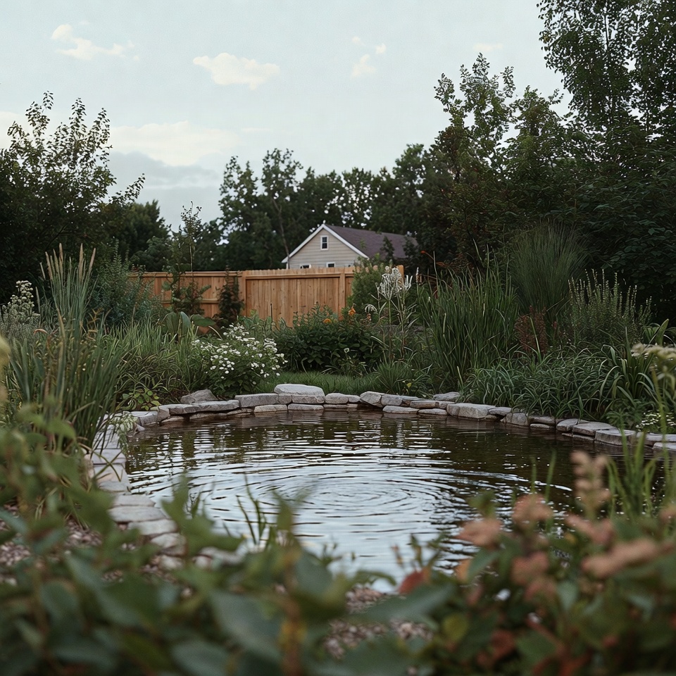 A serene backyard pond is surrounded by lush green plants, tall grasses, and white flowers. A wooden fence and a small white house with a dark roof are visible in the background. The water surface shows gentle ripples amid stone edging.