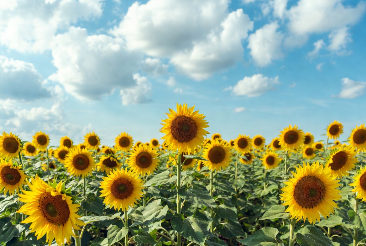 agriculture, bloom, blossoms, blue sky, bright, clouds, daylight, farmland, field, flora, garden, golden, green stems, horizon, landscape, nature, outdoor, petals, plants, rural, scenery, summer, sunflower field, sunny, vibrant, yellow flowers, sunflowers