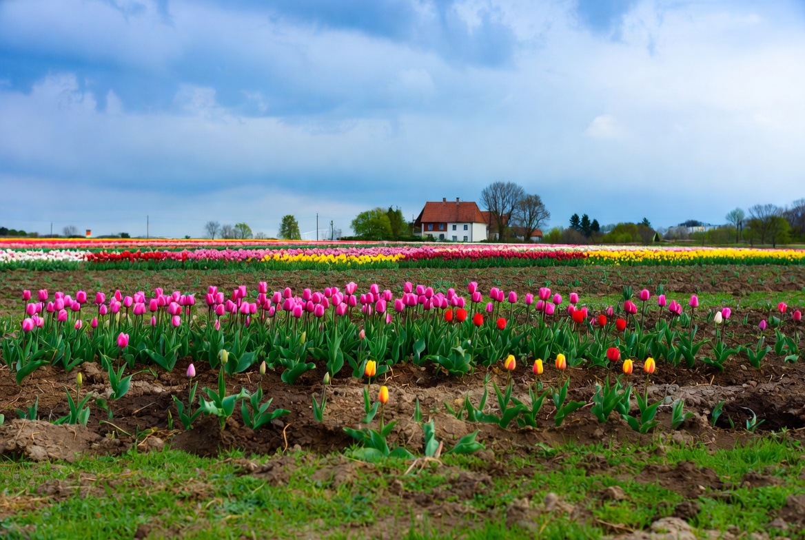 Netherlands tulips, blooming tulips, blue sky, cloudy sky, colorful flowers, farmhouse, flower farm, flower field, green grass, pink tulips, red house, red tulips, rural landscape, soil path, spring flowers, tulips, vibrant colors, white tulips, yellow tulips, tulip field