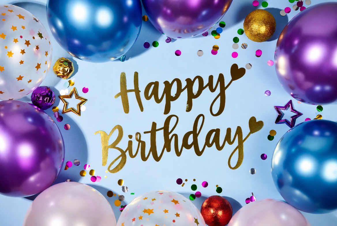 balloons, birthday text, blue background, celebration, clear balloon, confetti, festive, flat lay, glitter, gold balloons, gold text, hearts, isolated background, multicolored balloons, party decorations, purple balloons, red balloon, shiny balloons, sparkles, stars, happy birthday