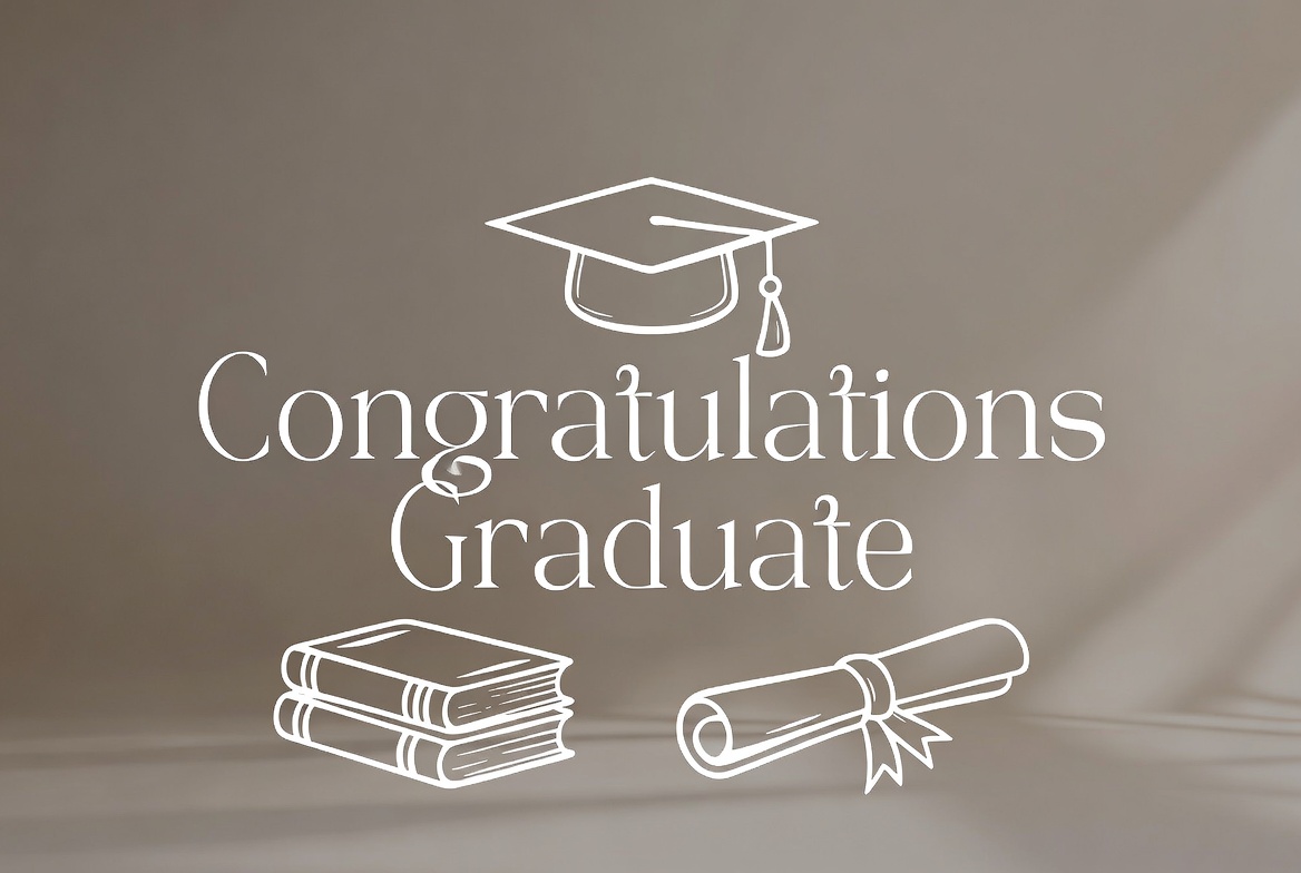 A minimalist line art illustration features 'Congratulations Graduate' text in elegant white font on a beige background with subtle shadows. It includes a graduation cap, stacked books, and a ribboned diploma below the text. The design uses clean outlines and a soft gradient for a modern card style.