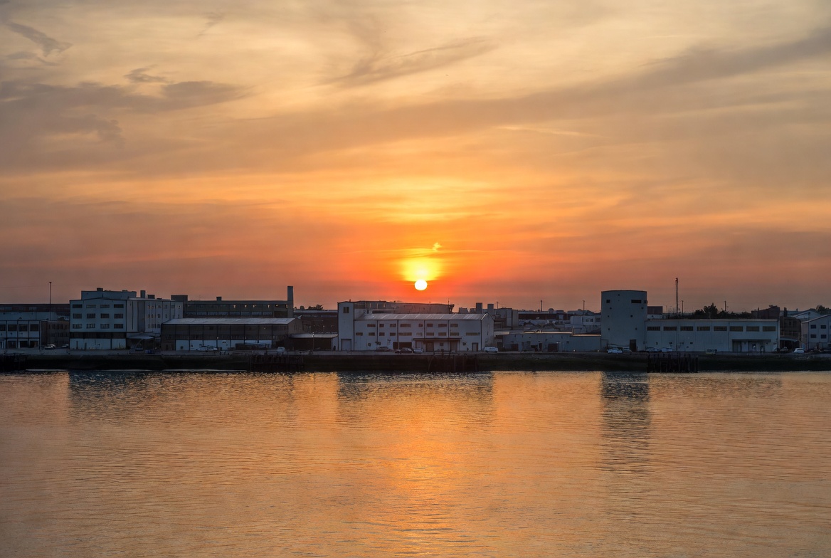 buildings, calm water, cityscape, clouds, coastal industry, dock, dusk, evening sky, factory buildings, golden hour, harbor, horizon, industrial buildings, orange sky, riverfront, seascape, serene landscape, silhouette, sun reflection, sunrise, twilight, urban waterfront, warehouses, water reflection, waterfront, sunset