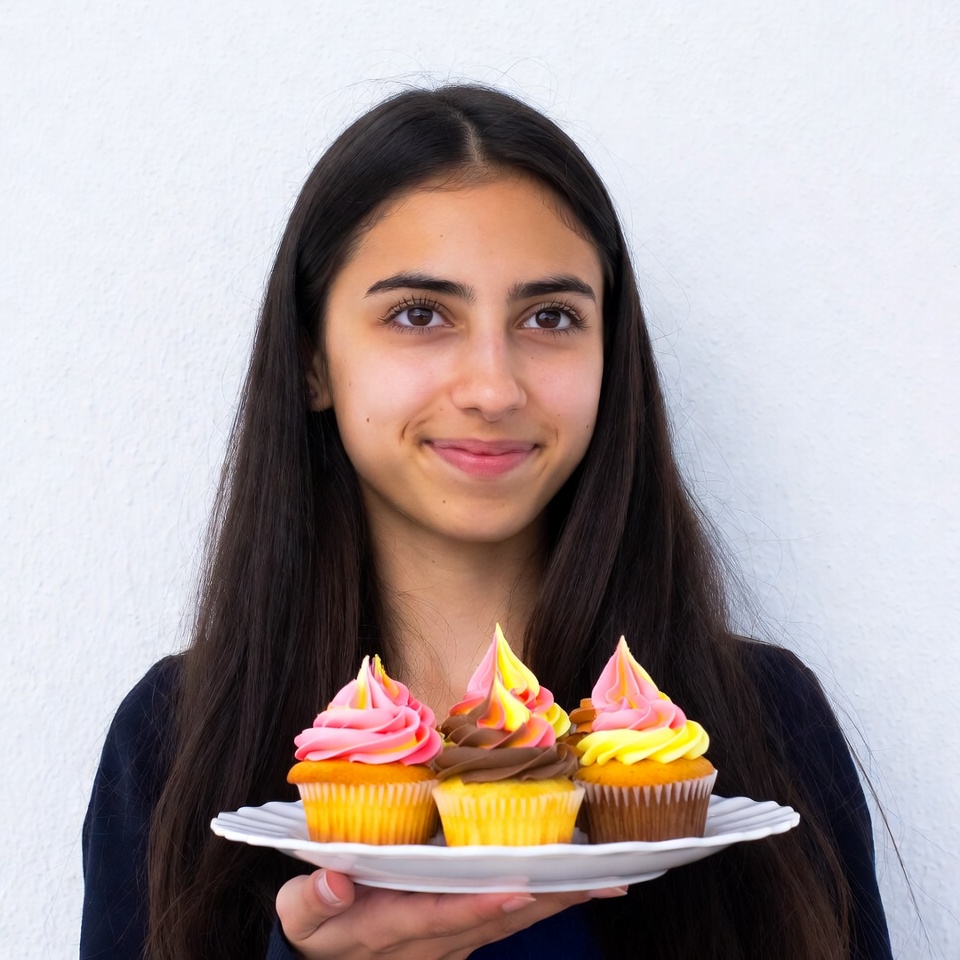 Middle Eastern, baked goods, chocolate frosting, colorful cupcakes, dark hair, desserts, female, holding plate, long hair, pink frosting, smiling, white background, white plate, woman, yellow frosting, young, girl