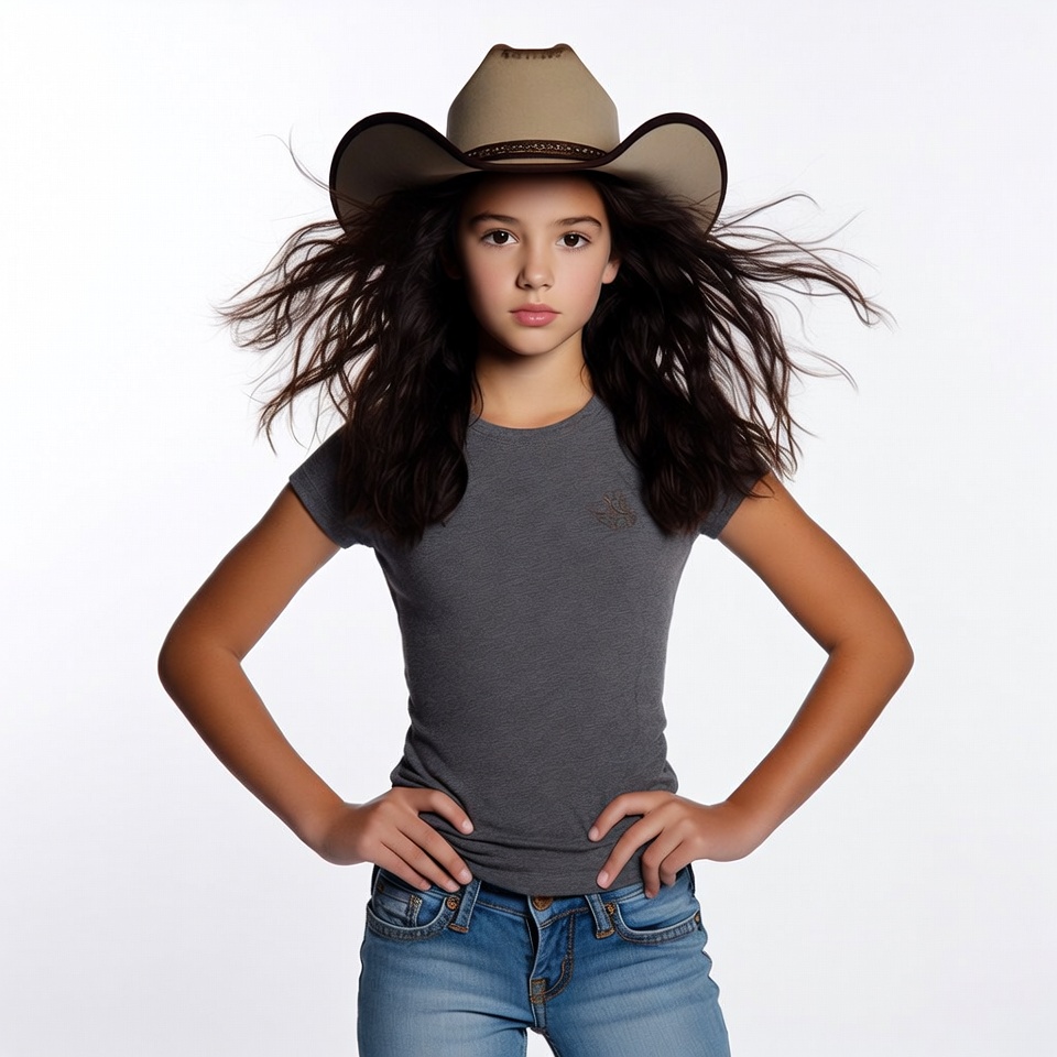 A young girl with long dark wavy hair stands confidently with hands on hips against a white background. She wears a large beige cowboy hat with a braided band, a gray short-sleeved t-shirt, and blue jeans. Her hair flows dynamically as if in motion.