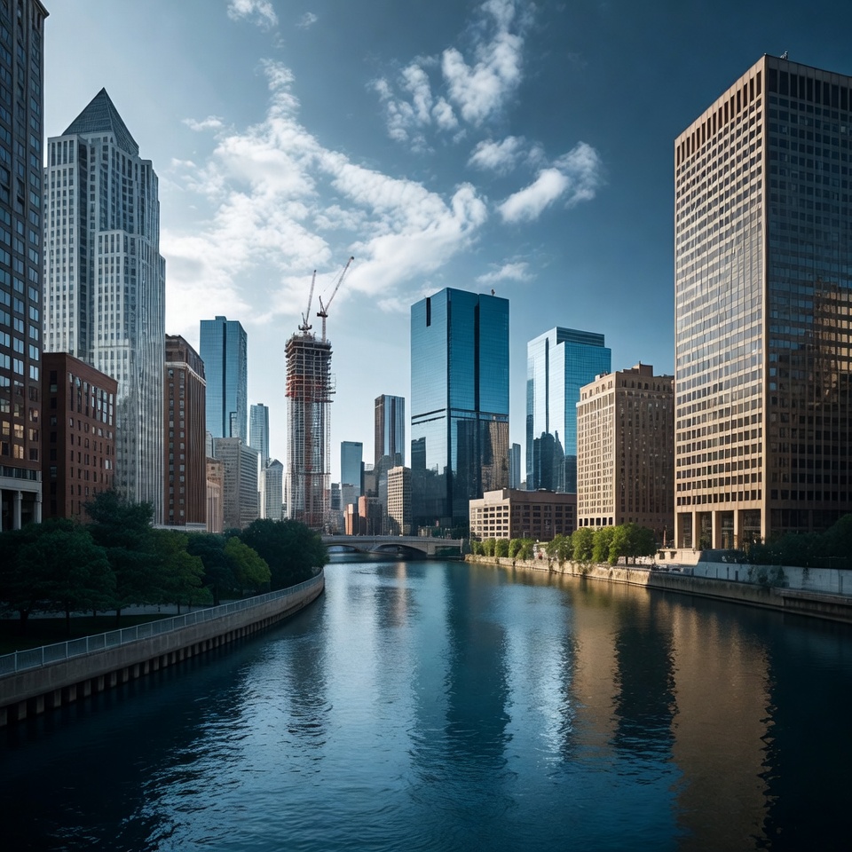 architecture, blue water, brick buildings, bridge, city river, cityscape, cloudy sky, construction crane, downtown, glass facade, green trees, high-rises, modern buildings, reflection, river, riverbank, skyline, skyscrapers, tall buildings, trees, urban, water, waterway, Chicago River