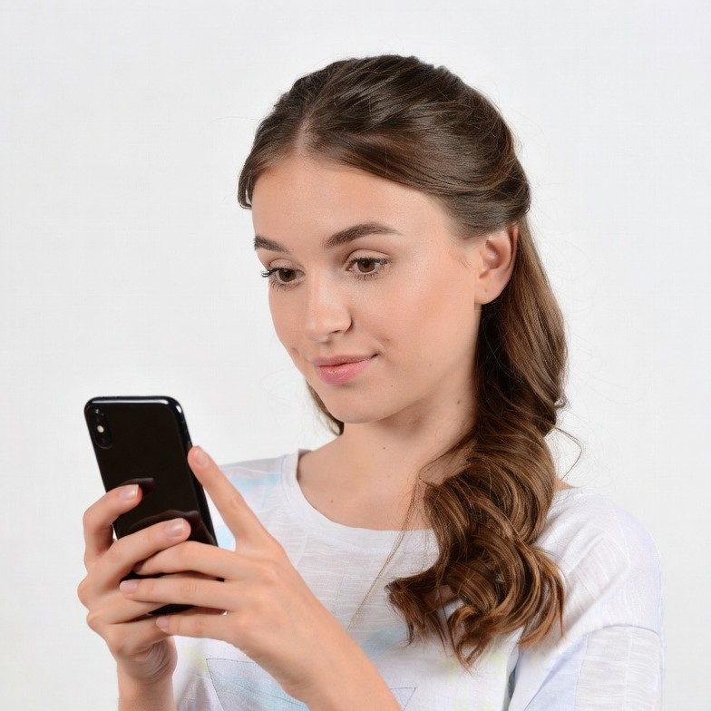 A young woman with long brown hair in a ponytail looks at her black smartphone held in both hands. She wears a light-colored top and stands against a plain white background. Her expression is focused as she touches the screen.