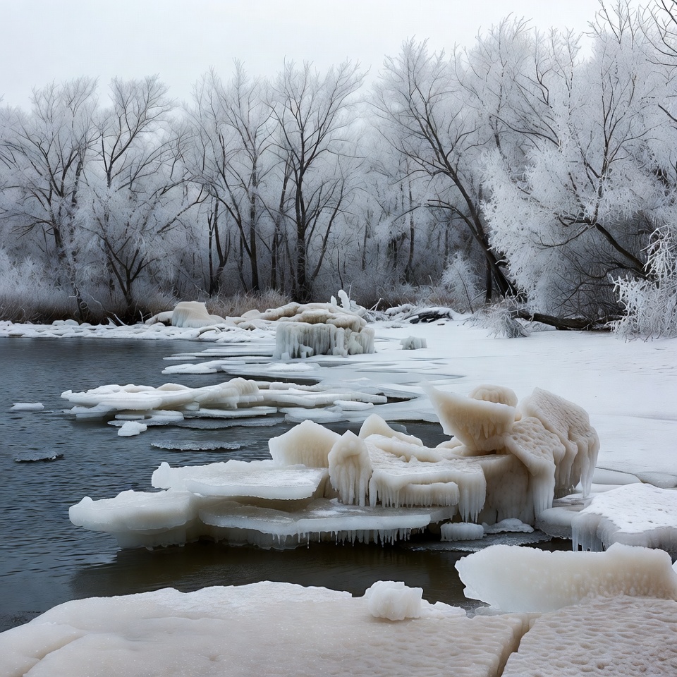 A serene winter landscape features a partially frozen lake covered in large chunks of ice and icicles. Bare trees coated in snow line the shoreline under a cloudy sky. The dark water contrasts with the white ice formations and snowy banks.