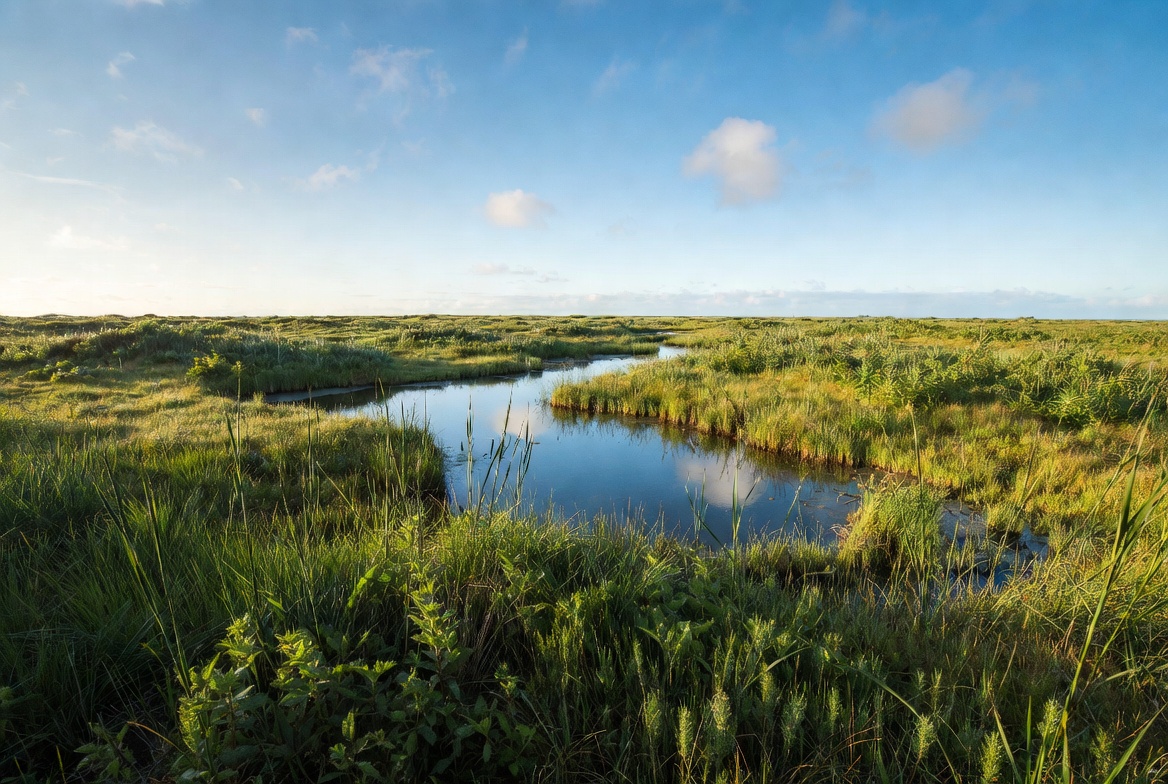 blue sky, calm water, clouds, environment, estuary, field, grass, green grass, horizon, landscape, meadow, natural habitat, nature, outdoors, peaceful landscape, reeds, river, scenery, sky, stream, sunlight, vegetation, water, waterway, wetland, marshland