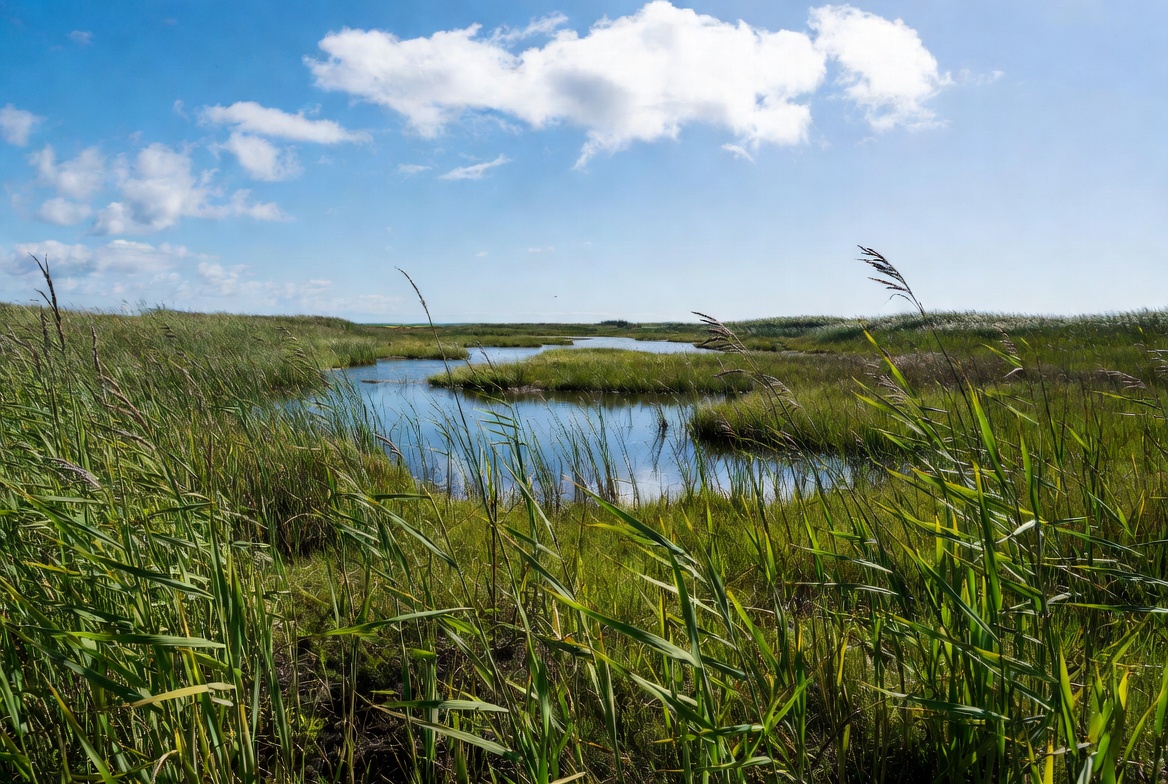 blue sky, blue water, clouds, environment, grass, green grass, horizon, landscape, lush grass, marsh, natural scenery, nature, outdoors, peaceful landscape, reed field, reeds, river, scenic view, sky, vegetation, water, watery marsh, wetland, winding stream, stream