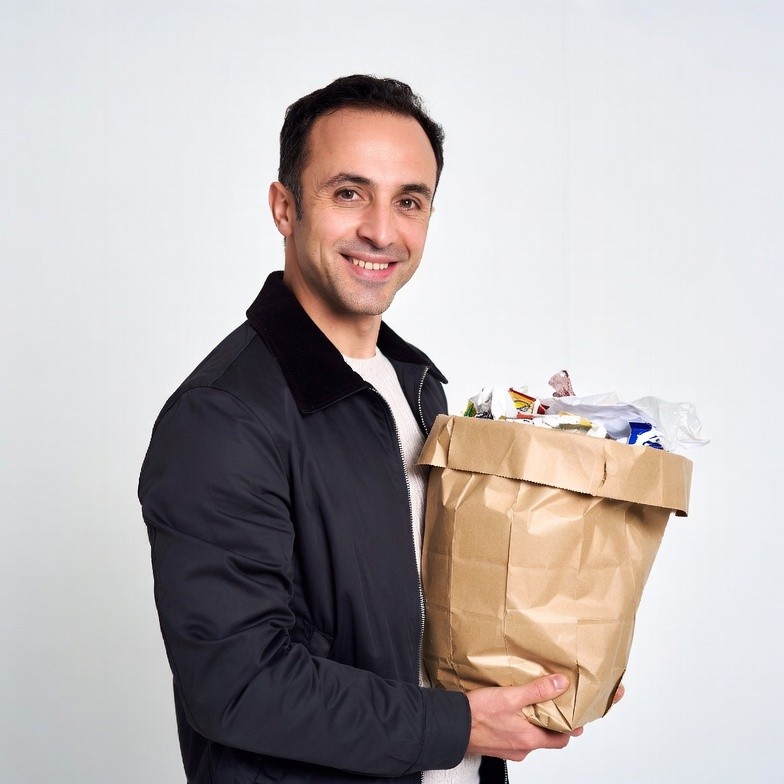 A smiling man with short dark hair stands against a white background, holding a large brown paper bag overflowing with colorful trash and waste. He wears a black jacket with a collar over a white shirt. The bag is gripped firmly in his hands.