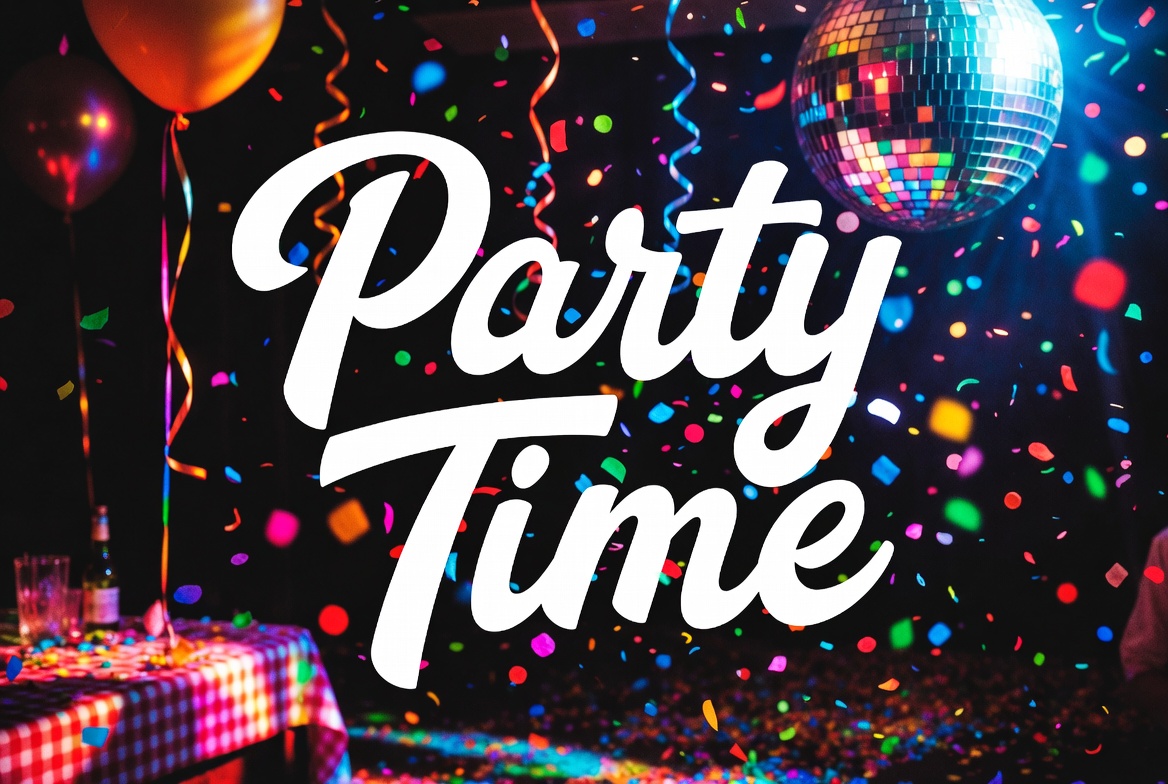 balloons, celebration, checkered tablecloth, colorful, confetti, dark background, disco, disco ball, festive, fun, glasses, graphic, illustration, orange balloon, party, shiny ball, streamers, text, vibrant, party time