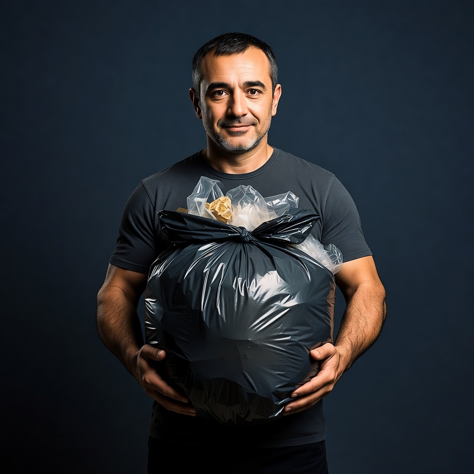 A Middle Eastern man with short dark hair and a slight smile stands against a dark blue background. He wears a gray t-shirt and dark pants while holding a large black plastic trash bag in front with both hands. Yellow plastic protrudes from the top of the tied bag.