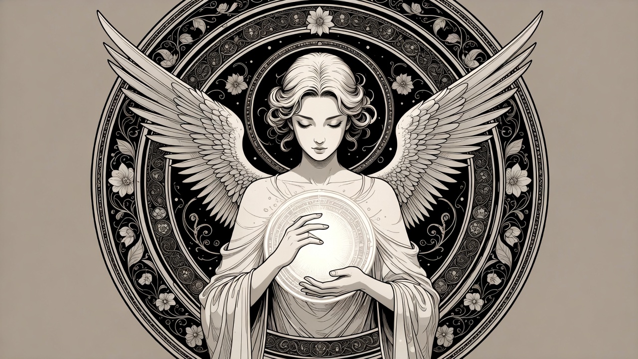 White, art nouveau, black white, decorative border, detailed drawing, digital illustration, ethereal, fantasy art, feathered wings, female, floral patterns, flowing robes, glowing orb, guardian angel, holy symbol, illustration, isolated background, long hair, mystical, ornate frame, religious icon, serene face, symmetrical design, vintage style, wings, angel