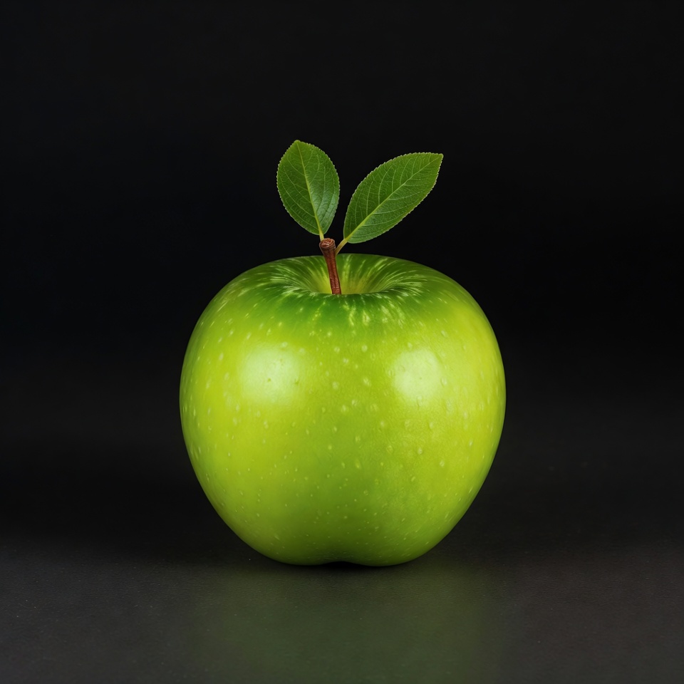 apple, black background, closeup, food, fresh, fruit, glossy, healthy, isolated, leaf, nature, produce, ripe, single apple, stem, studio shot, vibrant, green apple