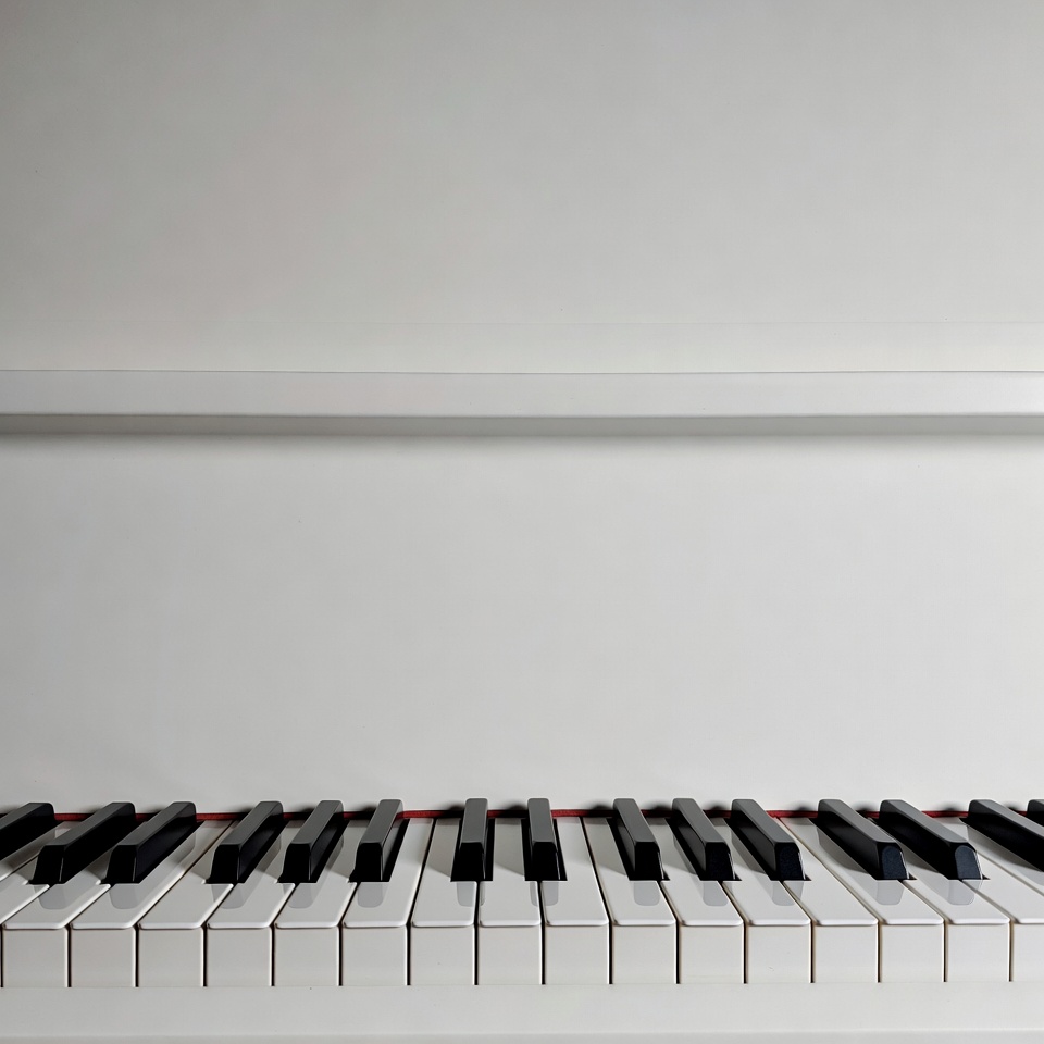 A black and white piano keyboard sits centered against a plain white background. The keys are neatly aligned, with white keys flanking the black ones. A white shelf is visible above the keyboard.