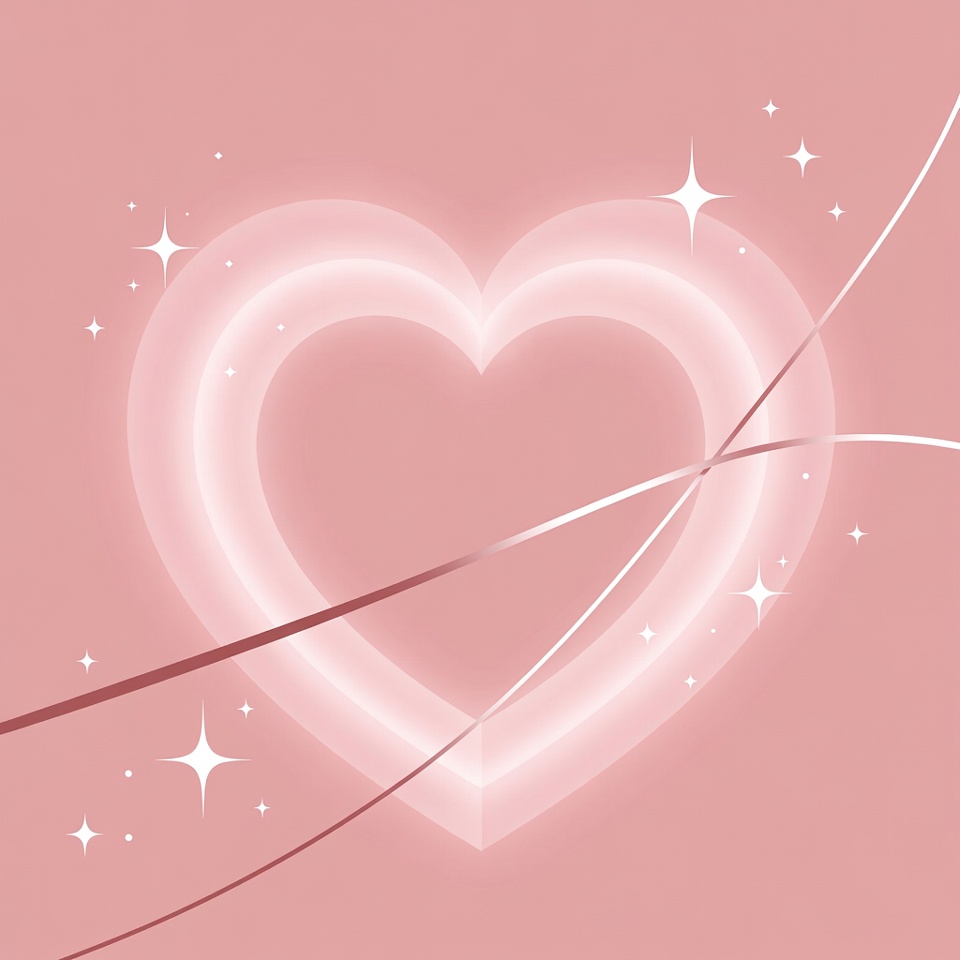 A large glowing heart shape in translucent pink dominates the center of a soft pink background. Surrounding sparkles and stars add a shimmering effect around the heart. Subtle white lines accentuate the design.