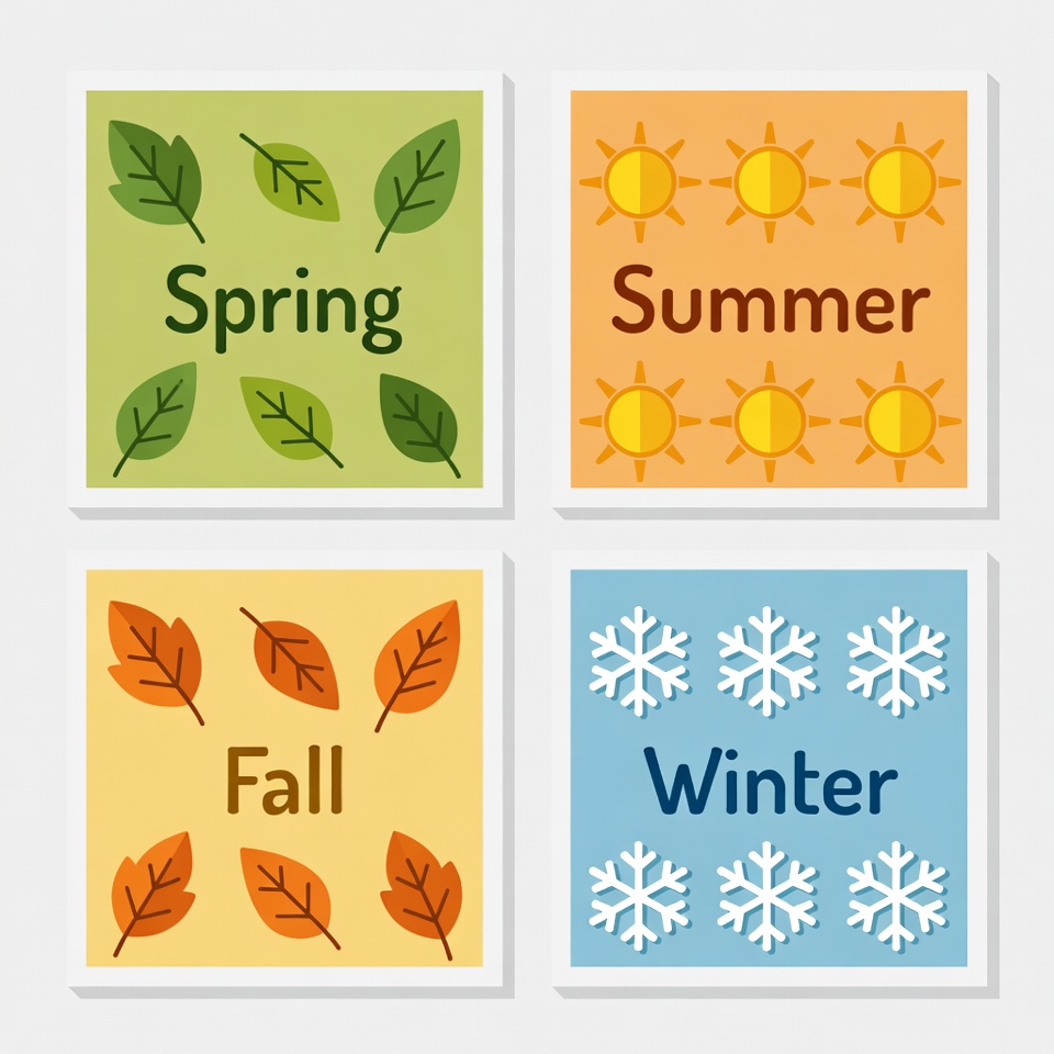 Four square clipart illustrations represent the seasons on an isolated background. Green leaves label Spring, suns label Summer, orange leaves label Fall, and snowflakes label Winter. Each season is depicted in a distinct color scheme with bold text.