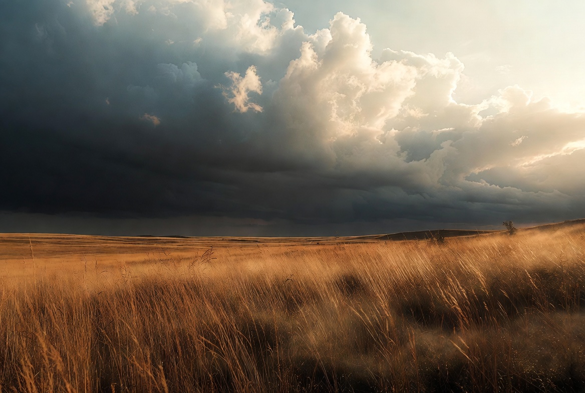 atmospheric, cloudy horizon, cloudy sky, dark clouds, dramatic sky, field landscape, golden grass, grassland, horizon, nature, outdoors, prairie, rural landscape, storm clouds, sun rays, sunset clouds, tall grass, wheat field, wilderness, grass field