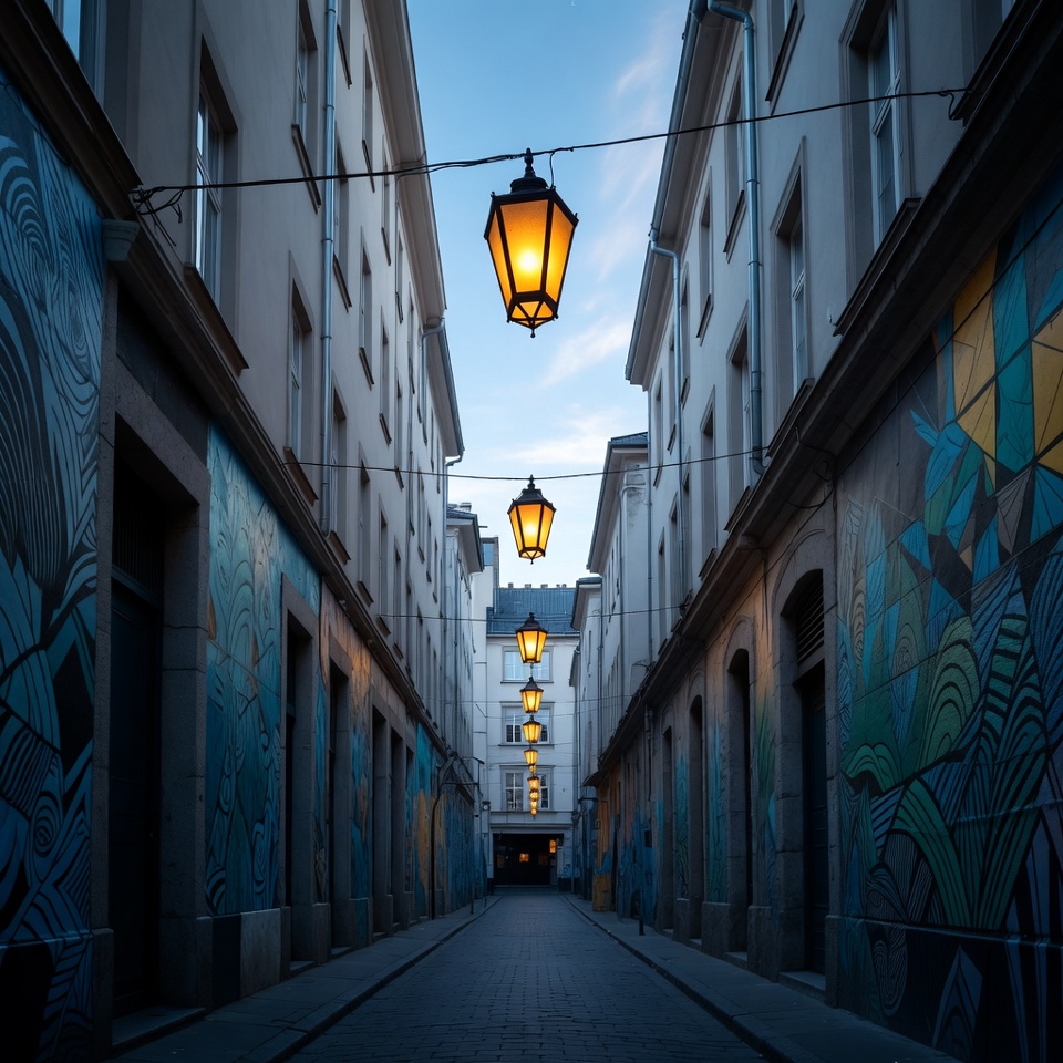 alley, architecture, blue graffiti, cloudy sky, cobblestone, dusk, europe, evening, graffiti, hanging lights, lanterns, old town, orange glow, street lamps, urban, white buildings, yellow graffiti, narrow street