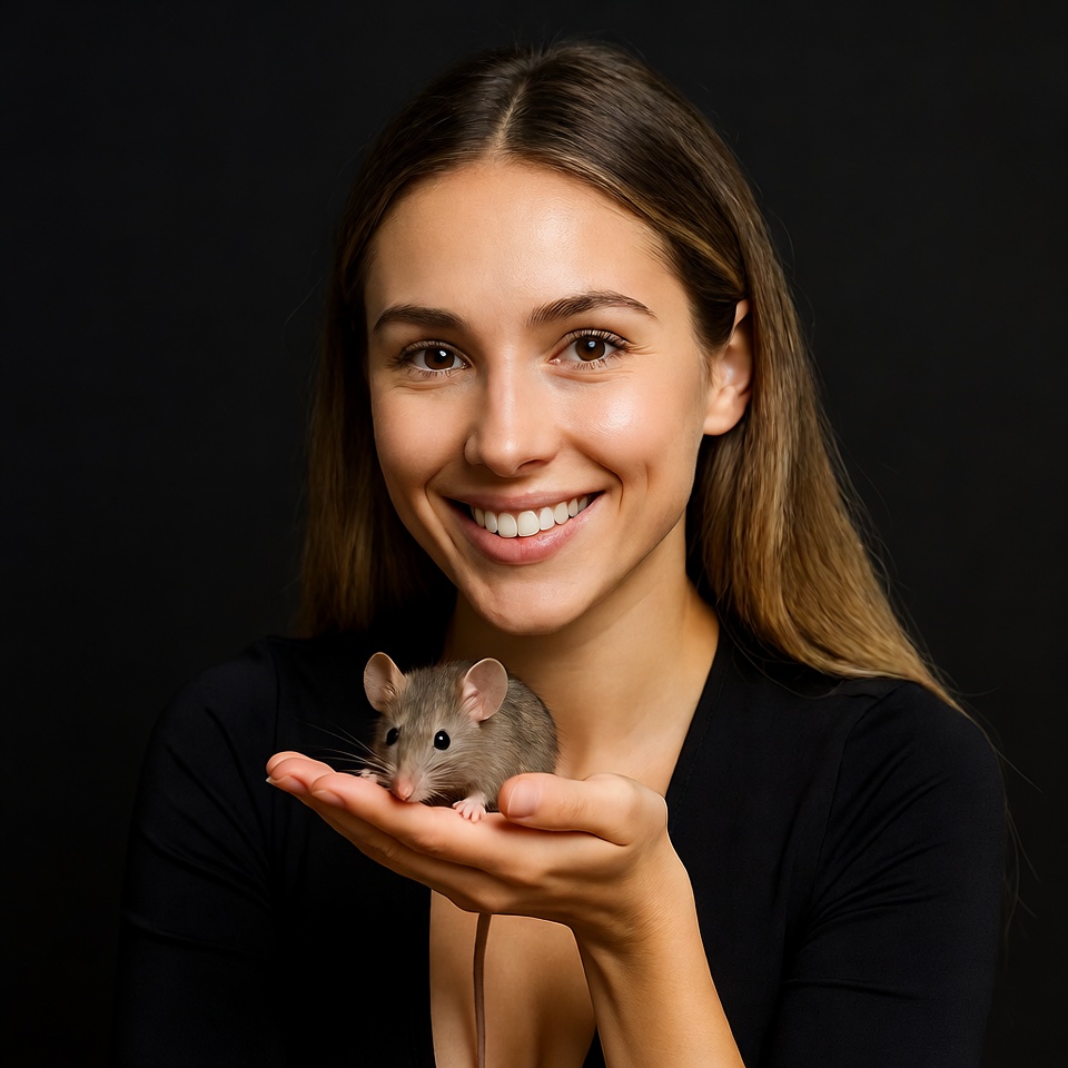 A young woman with long brown hair smiles while holding a small gray rat in her open palm. She wears a black sleeveless top and stands against a solid black background. The rat sits calmly with its pink paws and tail visible.